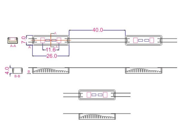 La 7mm latime, modulul 2led 0.36W este cel mai mic modul led, fiind folosit pentru litere volumetrice foarte inguste.